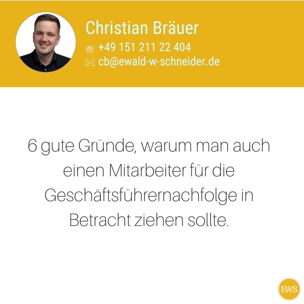 Die Entscheidung, einen eigenen Mitarbeiter für die Unternehmernachfolge zu wählen, anstatt einen externen Kandidaten, kann verschiedene Vorteile haben. Hier sind 6 Gründe, warum Unternehmen in bestimmten Fällen diese Entscheidung treffen: