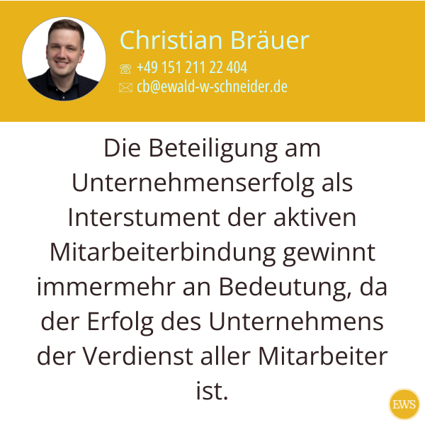 Ähnlich wie bei der Honorierung der individuellen Leistung muss das Modell der Beteiligung am Unternehmenserfolg einfach, transparent, einfach nachvollziehbar, für alle Kollegen gleich sein und im Arbeitsvertrag fixiert werden.